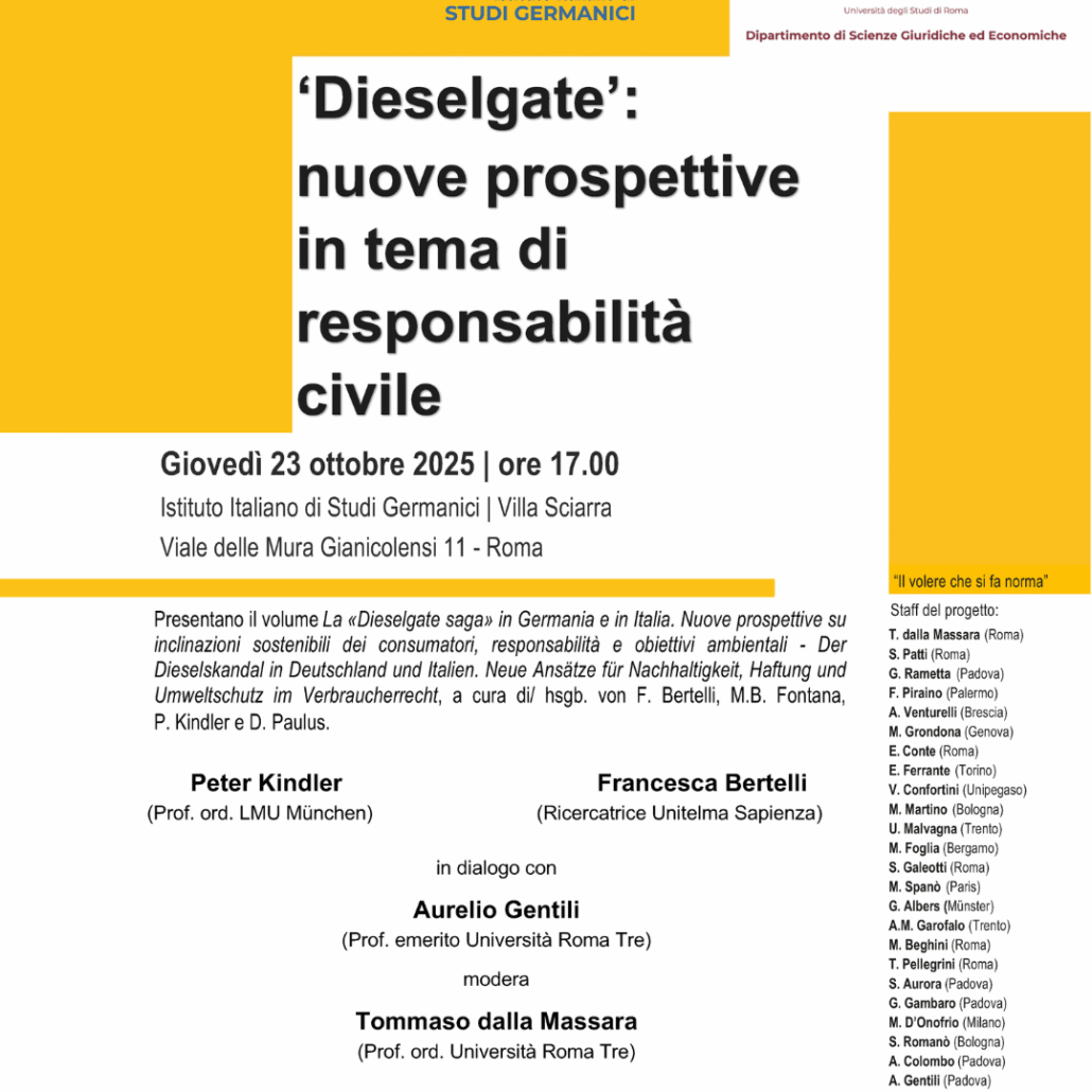 Il 23 ottobre 2025 l'IISG ospita la presentazione del volume La «Dieselgate saga» in Germania e in Italia. Nuove prospettive su inclinazioni sostenibili dei consumatori, responsabilità e obiettivi ambientali nell'ambito del progetto Il volere che si fa norma.