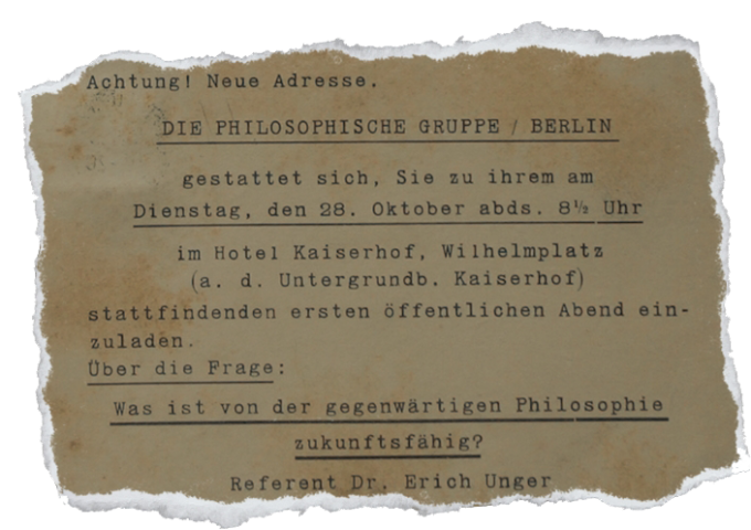 La ricerca intende ricostruire la vicenda della cd. “Philosophische Gruppe”, iniziativa promossa da un cenacolo ristretto di intellettuali ebrei-tedeschi come Erich Unger, Adolf Caspary, Simon Guttmann, Ernst Fraenkel, Joseph Markus e altri. Poiché tale gruppo si è costituito grazie all’influsso di Oskar Goldberg (1885-1952), storico delle religioni e filosofo, è talvolta conosciuto anche con la denominazione di Goldberg-Kreis. Negli anni tra 1927 e 1932 la Philosophische Gruppe ha organizzato, attraverso inviti ad personam, annunci e affissioni, frequenti serate di discussione filosofica, politica, economica, scientifica e giuridica. Gli incontri si svolgevano in luoghi pubblici e privati di Berlino e divennero ben presto crocevia di idee e relazioni.
